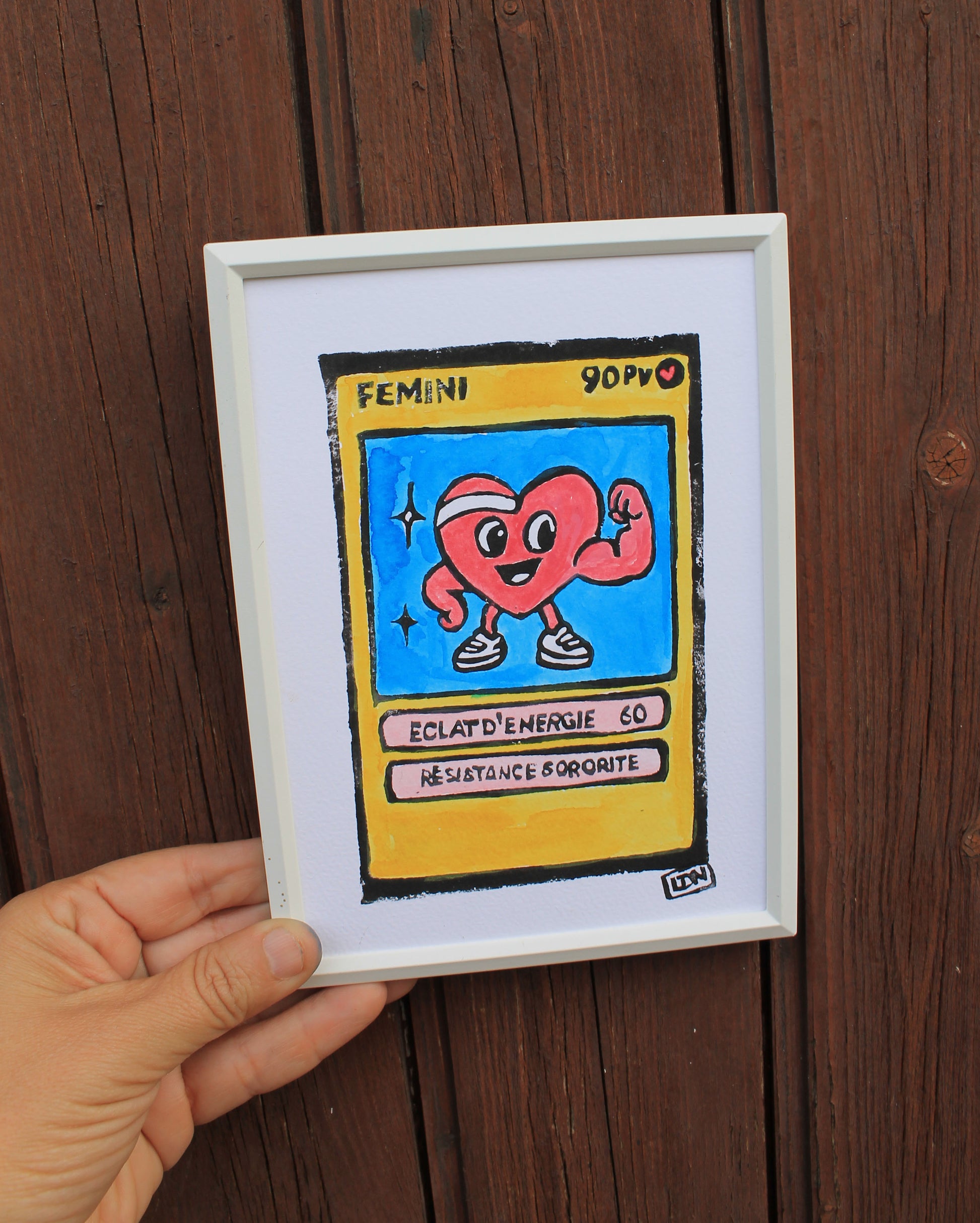InspirĂ©e des cartes de jeux dâenfance, FEMINI mĂ©lange humour, puissance et messages positifs.