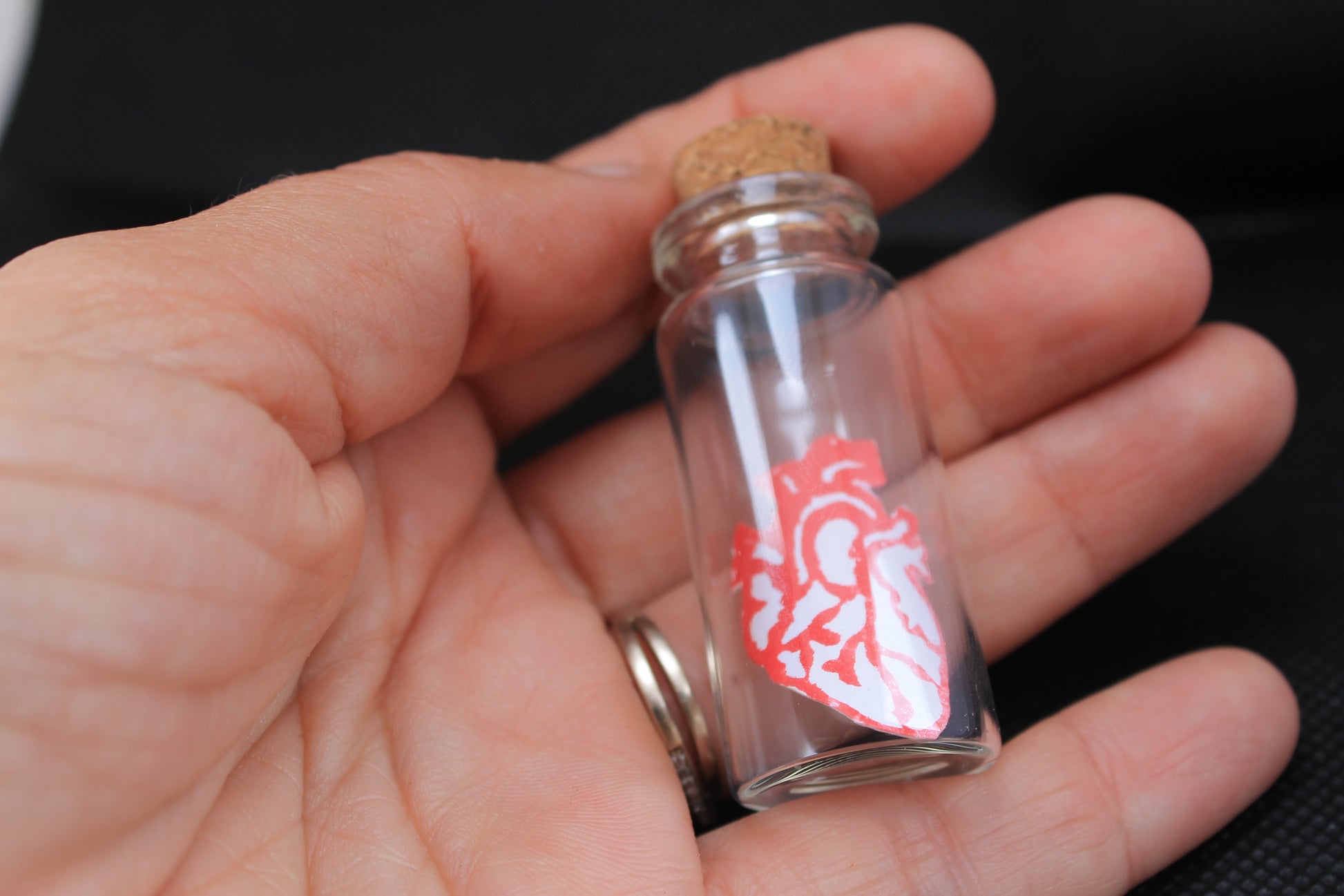 Bouteille en verre miniature – Cœur anatomique gravé et imprimé en rouge sur papier